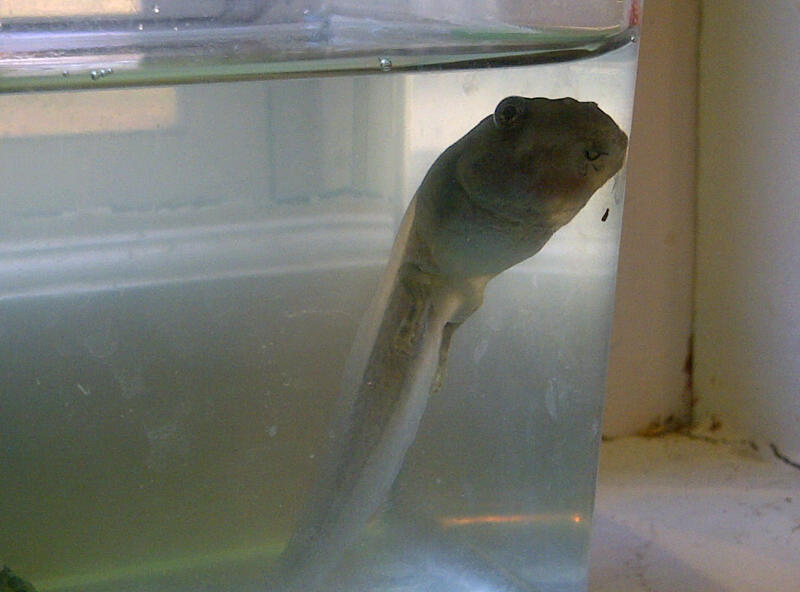 Aden named him/her (we’re not sure which) Caroline and “she” lives in a small plastic tank on our kitchen windowsill. The pet storeowner told us she would need something in the tank if she turned into a frog, so she could climb on and breath above the open air. We had an old plastic shark from a departed goldfish’s tank so that’s all the diversion Caroline enjoys, besides watching us humans rush around.