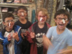 Each completed task earned points and the team that got to certain stops first received special candy treats (ring pops, Pez, pop rocks, etc). The tasks ranged from educational (add up how much Aden’s favorite meal costs at a restaurant, budget money to buy clues) to silly (try on lipstick and/or nail polish—huge hit with giggly boys.) The winners got the most points within the allotted time limit. My uber-competitive boys loved the thrill of the hunt and came up with many creative ways to increase their points.